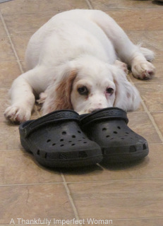 Boy he loves chewing on those Crocs! They must have just the right amount of chewiness for his sharp little puppy teeth! Little bugger.
