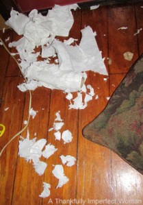 Out we go again, duties done, back in, and on the couch I go…and off goes Motzy to play with his toys. At this point I’m exhausted. Needless to say I zonked out. Literally. I finally wake up all of a sudden at 7:20 as he decides to join me on the couch. I look around (after escaping puppy licks that have now wiped my face clean) and find what you see in the picture behind one of our chairs.