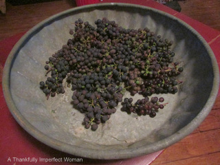 Needless to say this NEVER happens, so I looked at him rather strangely, opened the door and he said “You need to come look at the grapes!  They’re ripe and beautiful – hanging down through the arbor!”  We’ve had the grapevines for years (there’s even a sweet story of a gift Tim brought me when we were courting (all two and a half weeks of courting that is), but I digress).  This is the first year they’ve been this bountiful.