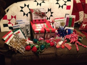 I added in a few gift tags, 4 boxes of Christmas Cards (which won’t be enough, but it’s a good start), and 4 dog toys (FABULOUS…one more treat for each of the pups and their Christmas shopping is done!).