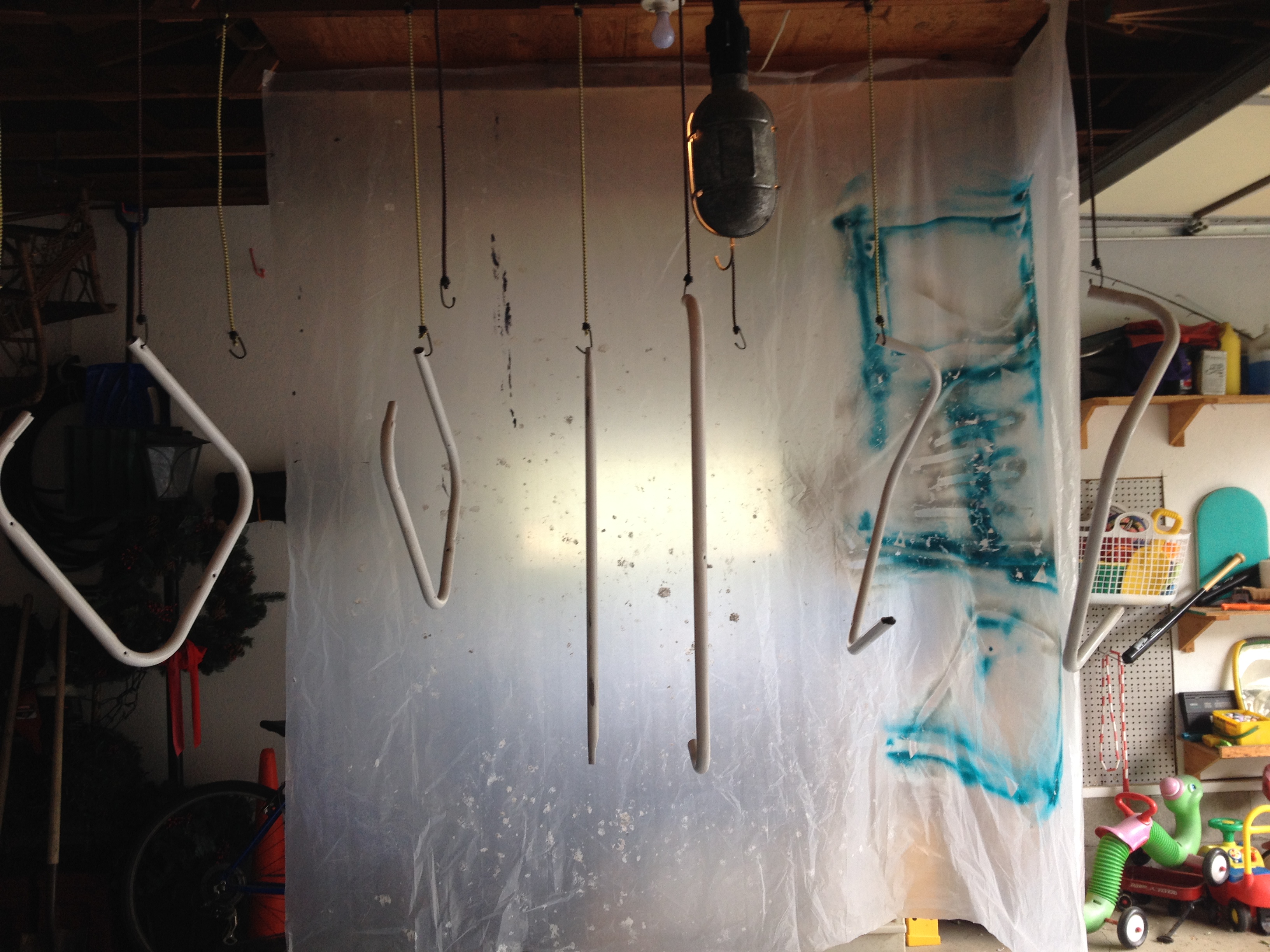 So I went to work.  I made myself a spray paint station in the garage (it was too windy outside).  I hung plastic drop clothes in a square with a staple gun and secured one to the floor.  I nailed some nails up about a foot apart.  And on those, I hung bungee cords.  Taaa-daaaaa!