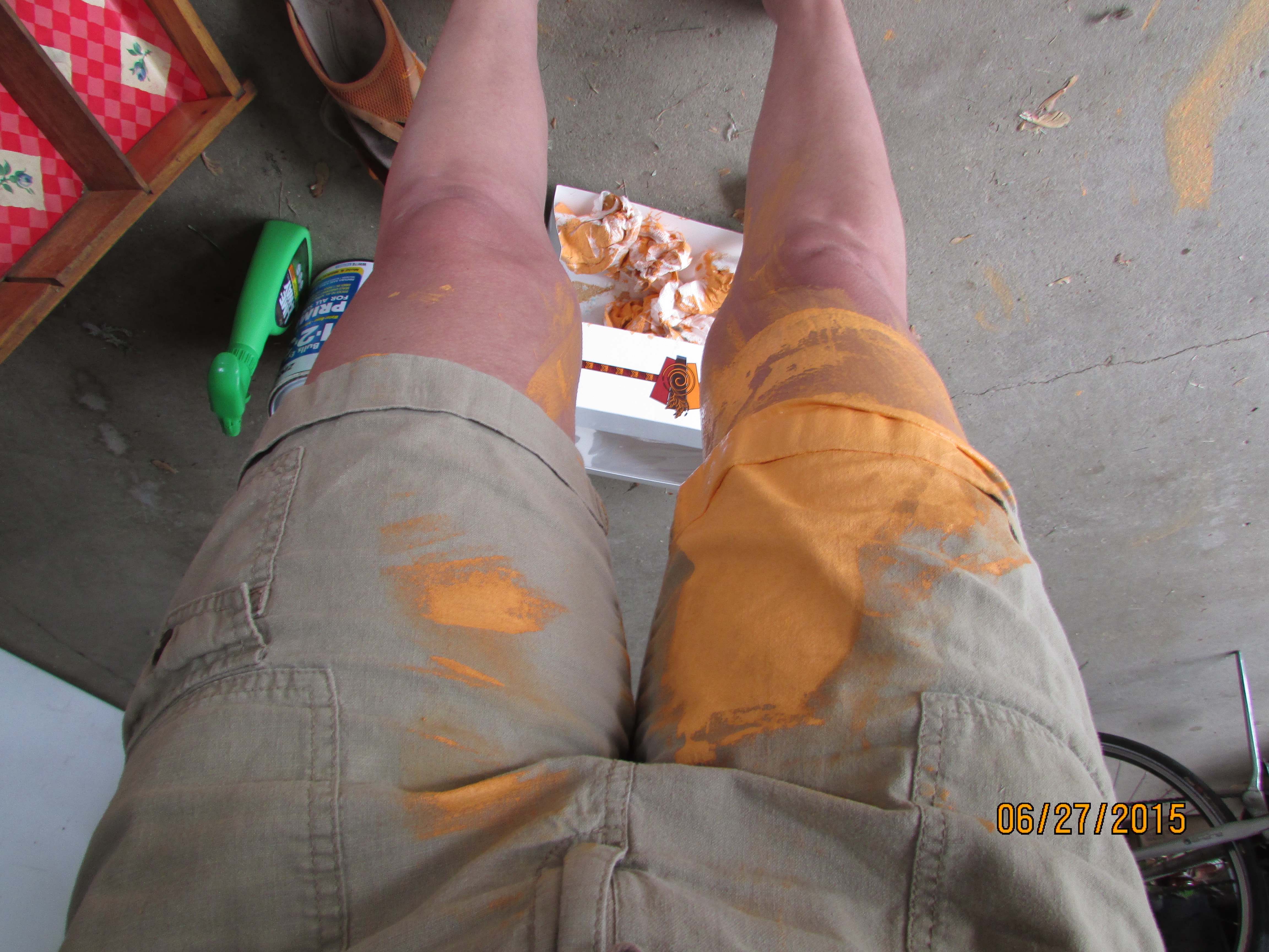 All of a sudden I was standing there with paint dripping down my shorts…all over my shirt, arms, legs, shoes…toes.