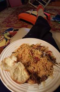 As you can tell by the picture, we ate dinner casually in the living room last night. (What you see beyond my feet is my latest project. Stay tuned for my next blog!)